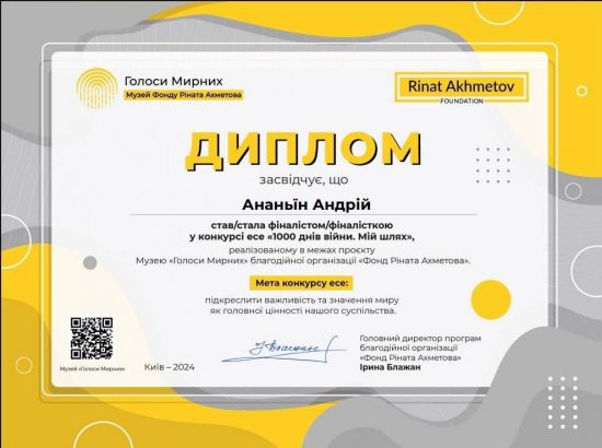 наші учні, Ананьїн Андрій та Дмітрієва Ліза стали фіналістами конкурсу “1000днів війни.Мій шлях” від благодійної організації “Фонд Ріната Ахметова”.